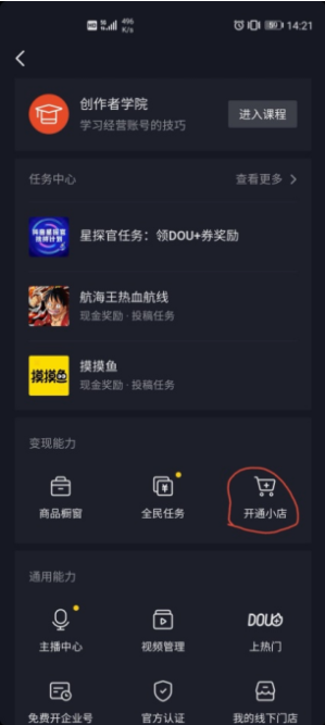 选择并点击了“创作者服务中心”会出现一个新页面,如图所示在变现能力里面有一个“开通小店”的选项,选中并点击它。