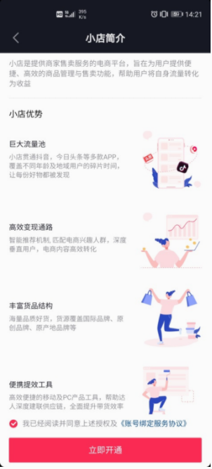 在这个界面点击立即入驻后来到最后一个页面,如图。在此页面勾选同意操作后,即可开通抖音店铺了。