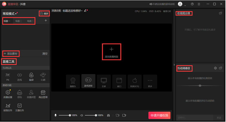 接下来简单介绍一下直播伴侣的界面。左上角可以选择场景,设置横竖屏,添加直播素材,左下角主要是一些常用的直播工具,分互动玩法和基础功能两个模块,右上角可以看到直播榜单,右下角是互动区,可以看到粉丝发送的弹幕,中间区域为直播画面预览区域,中下部用来设置开关播,显示官方公告。