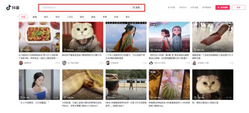 进入官方首页就可以观看自己喜欢的视频了,这里有各种各样的分类可以选择,涵盖了游戏、美食、时尚等多个领域,当然你也可以在搜索框寻找自己喜欢的抖音达人和视频
